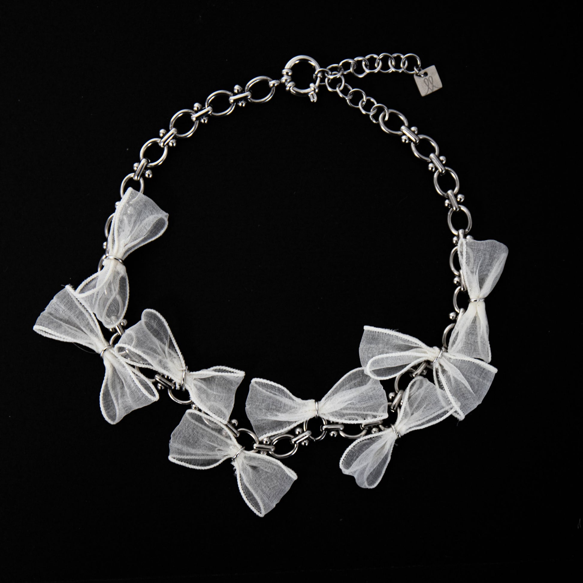 Ce ras-de-cou est une pièce délicate et féminine, mêlant une chaîne en acier inoxydable argenté à de petits nœuds en organza de soie façonnés à la main dans notre atelier parisien.