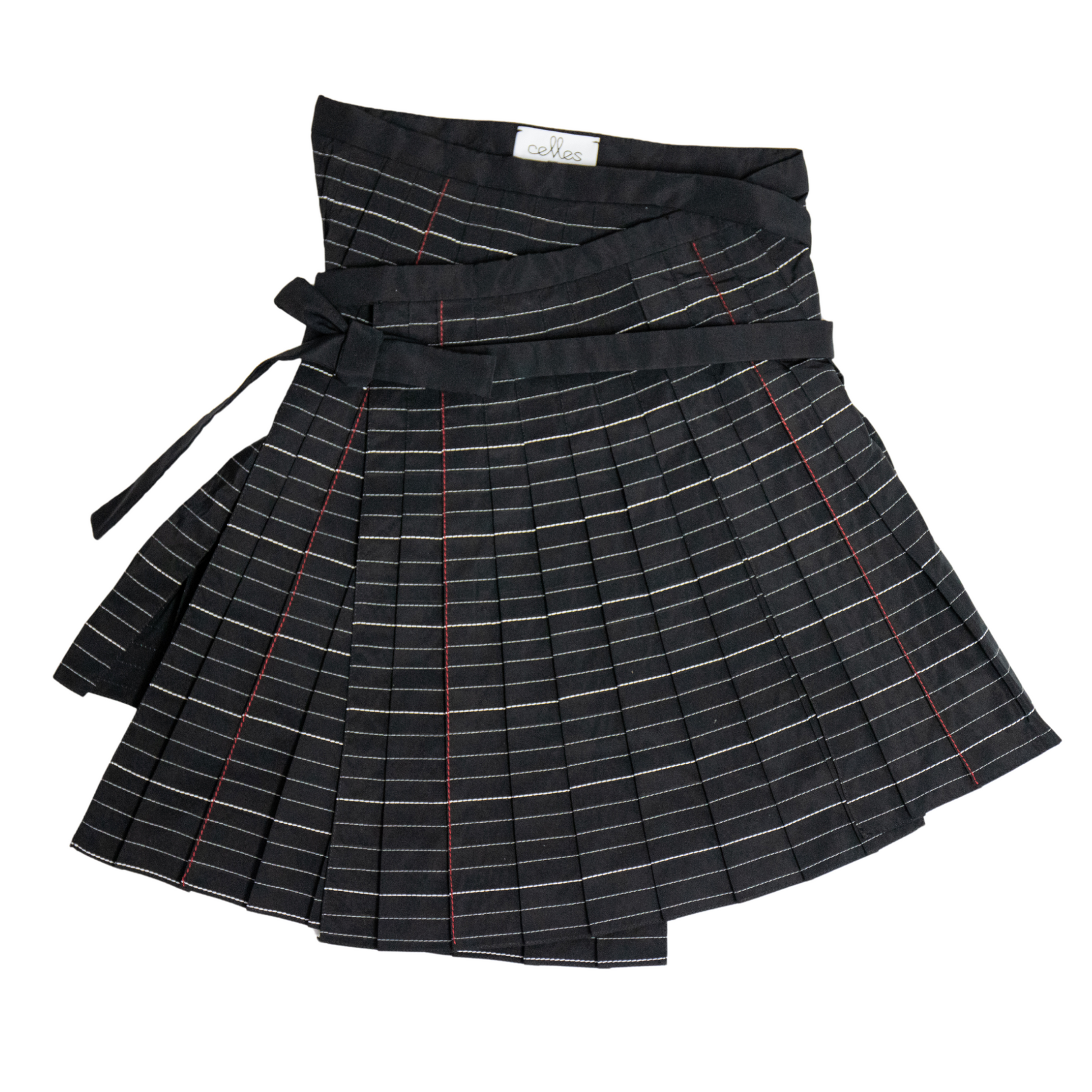 La jupe plissée portefeuille est confectionnée en taffetas de coton, avec des surpiqûres minutieuses représentant le motif d'une feuille d'école. Cette jupe évasée, à longueur irrégulière, est parfaite pour un style en superposition (‘layering’)